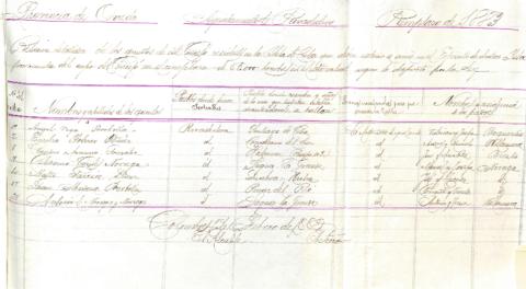 Relación detallada de los quintos del concejo de Ribadedeva residentes en Cuba que deben entrar a servir en el ejército de dicha isla, por cuenta del cupo de este municipio, en el reemplazo de 1883.
